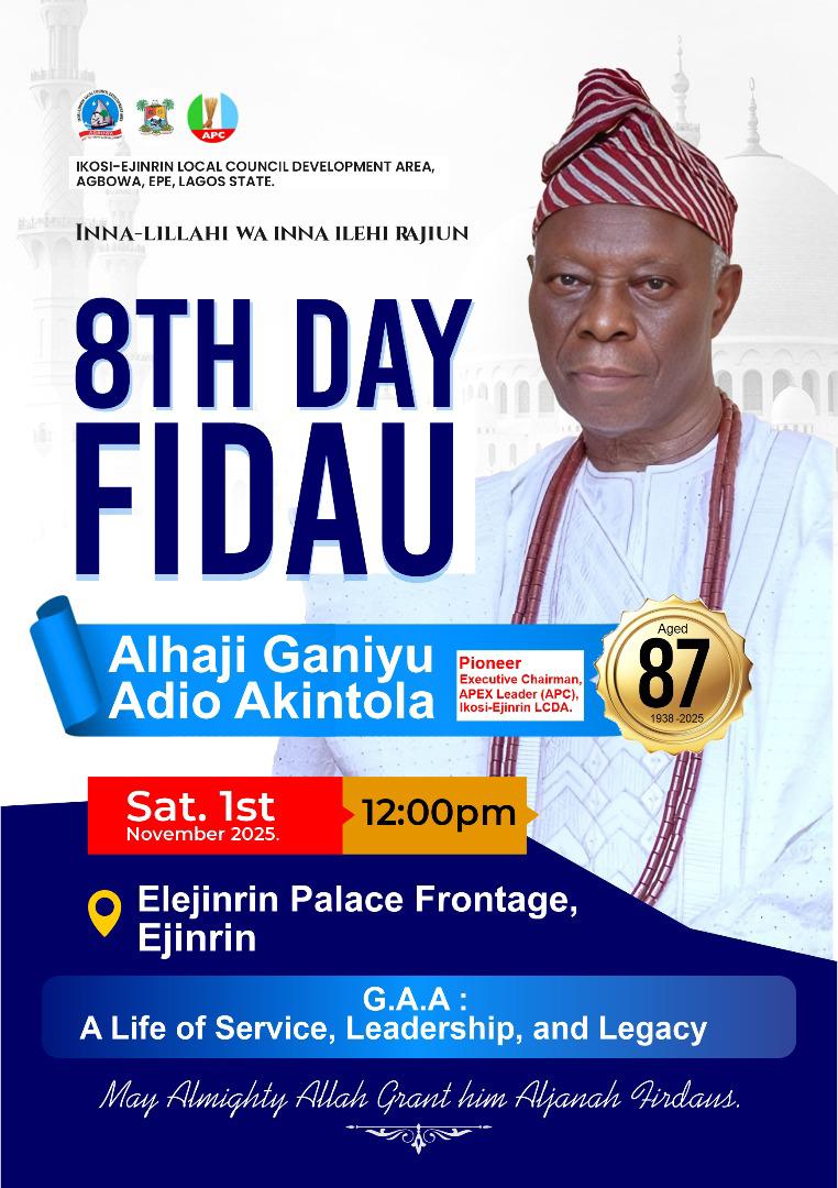 The Executive Chairman of Ikosi-Ejinrin Local Council Development Area, Otunba (Akogun) Wale Raji Anomo, has announced the holding of an 8th-Day Fidau Prayer in honour of late Alhaji (Otunba) Ganiyu Adio Akintola, the pioneer Executive Chairman of the council who passed away on Saturday, October 25, 2025.