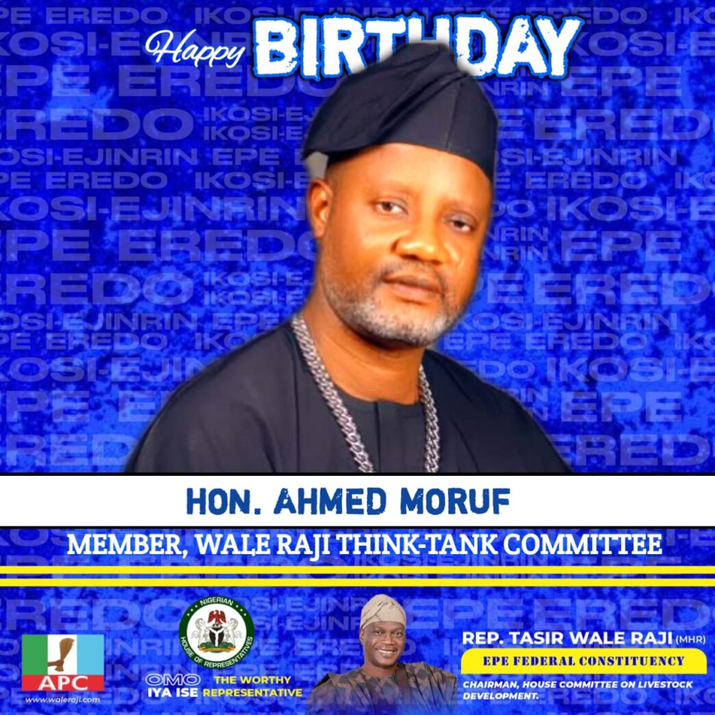 The Member representing Epe Federal Constituency in the House of Representatives and Chairman, House Committee on Livestock Development, Hon. Wale Raji, has extended warm birthday felicitations to Hon. Ahmed Moruf, describing him as a loyal ally, steadfast team member, and dedicated public servant.